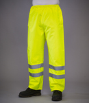100% waterproof 300D polyester with oxford PU coating. Conforms to EN ISO 20471: 2013 + A1: 2016 class 1 (yellow only). All colours conform to EN343: class 1. Stitched and taped seams. Elasticated waistband. Two side pockets. Two reflective bands around lower legs. Open leg ends with stud adjusters.